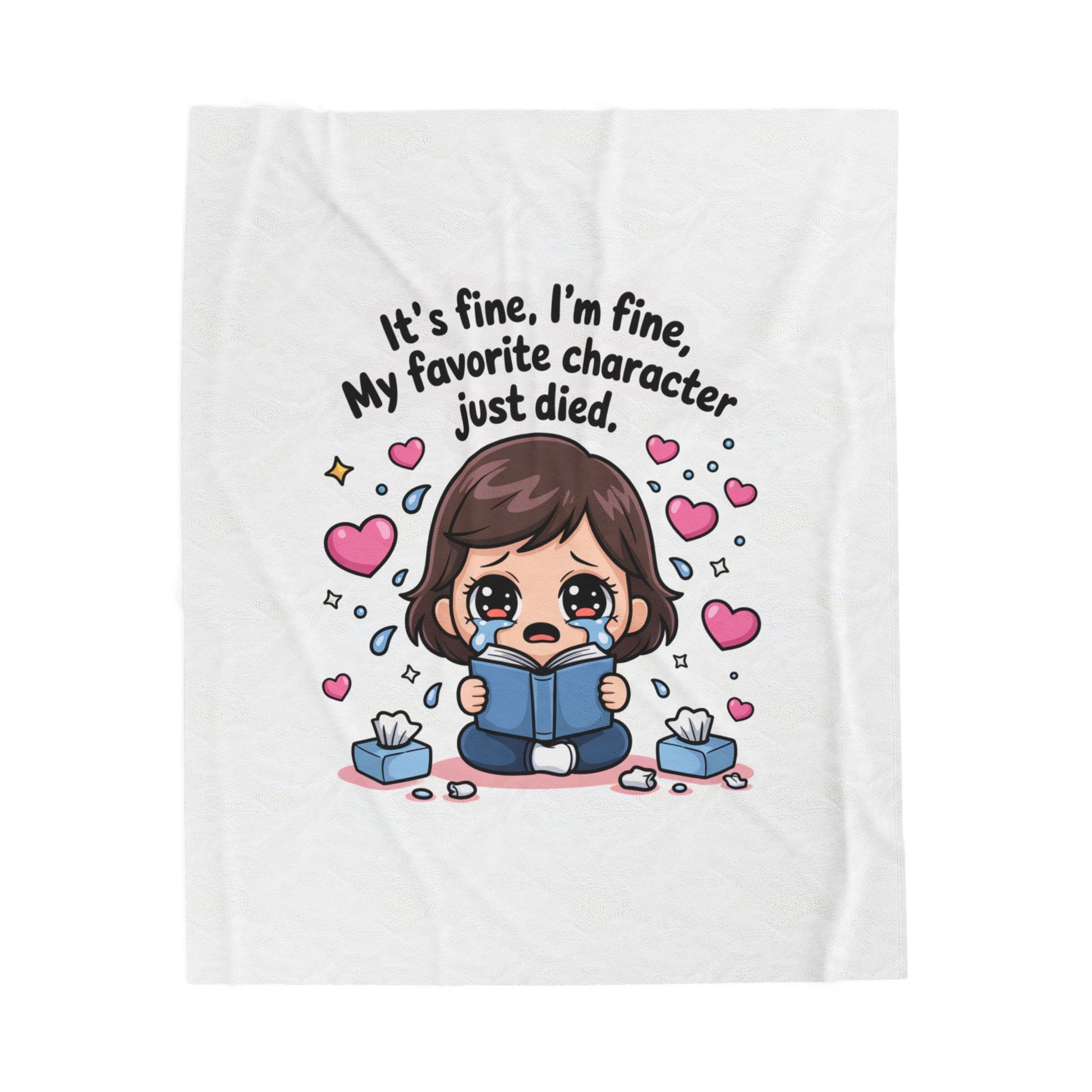 Wrap yourself in comfort and relatable chaos with this funny emotional throw blanket featuring the quote “It’s fine, I’m fine, my favorite character just died.” Perfect for readers, binge-watchers, anime lovers, and anyone who gets deeply attached to fictional characters. Printed on a soft, cozy 50" × 60" blanket, it’s ideal for couches, beds, dorm rooms, and late-night crying sessions over book or TV heartbreak. A unique gift for fandom friends, teens, and emotionally invested introverts who cope with humor and blankets.