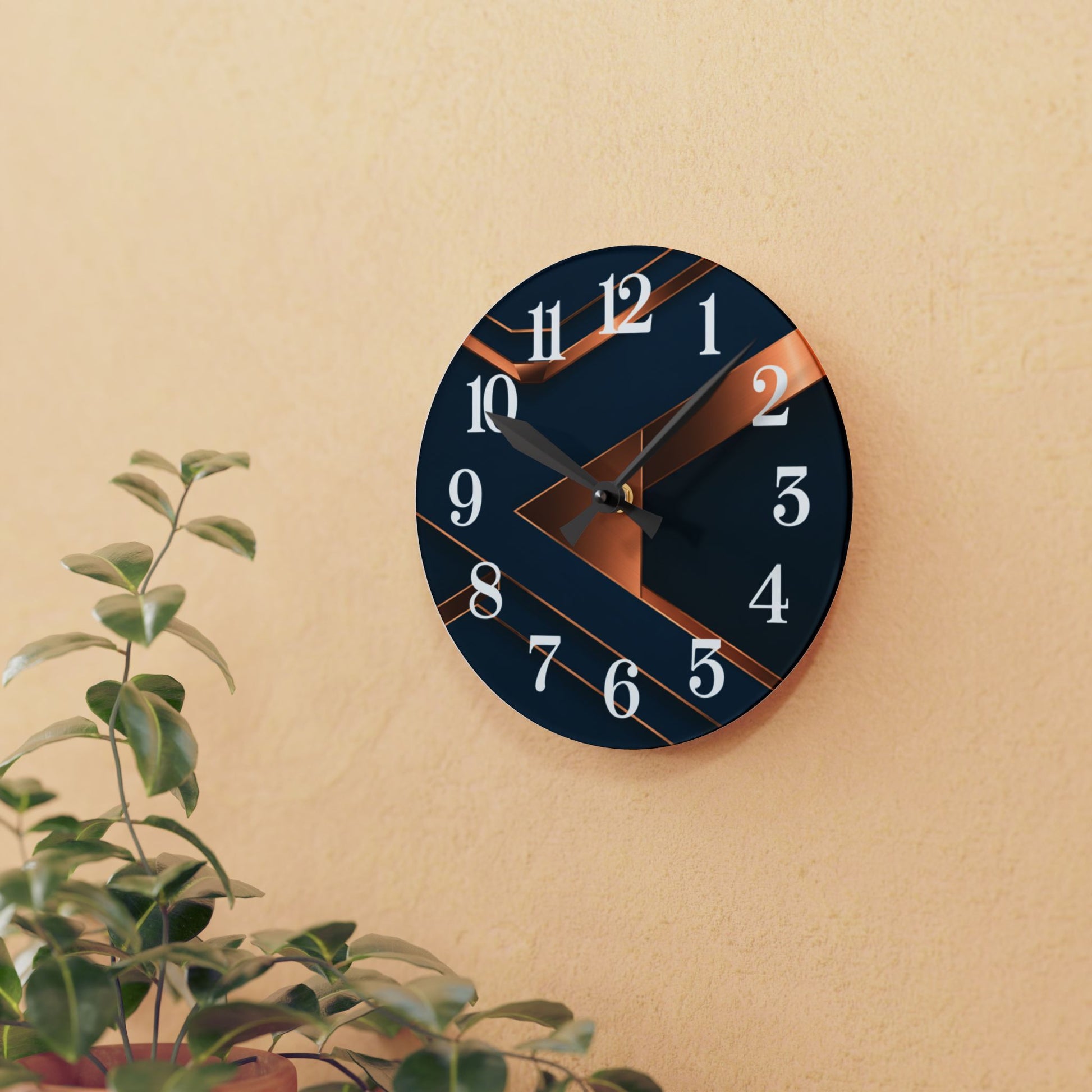 Add bold, contemporary style to any space with this stunning navy and copper geometric wall clock. Designed with clean lines, metallic accents, and crisp white numerals, this 8" × 8" round clock brings a touch of modern luxury to living rooms, bedrooms, offices, studios, or entryways. Its striking color palette fits seamlessly into modern, masculine, industrial, and minimalist home decor. Lightweight, functional, and eye-catching, it makes a perfect housewarming gift, office upgrade, or stylish accent piece for any room.